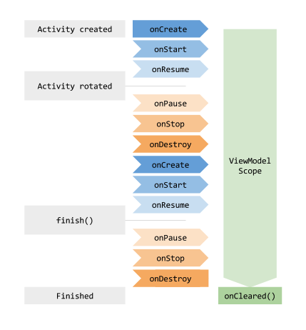 ViewModel의 인스턴스는 Activity의 onCreate()에서 요청을 하고, Activity의 인스턴스가 소멸되고 다른 인스턴스가 생성되더라도 위의 그림처럼 ViewModel의 수명주기가 일관되게 유지되기 때문에, 데이터 소실 없이 기존 데이터를 사용할 수 있다는 것이다!
