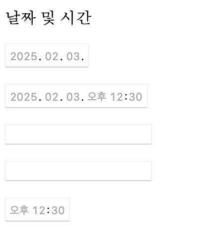 날짜 및 시간 또한 type을 통해 지정할 수 있다. 이때 각각의 브라우저에 맞춘 디자인으로 나타난다고 한다.